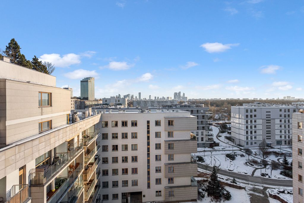Samo mieszkanie zlokalizowane na 8. piętrze urzeka pięknym widokiem na wieżowce centrum Warszawy. Taras jest duży i mieści wygodne tarasowe meble.
