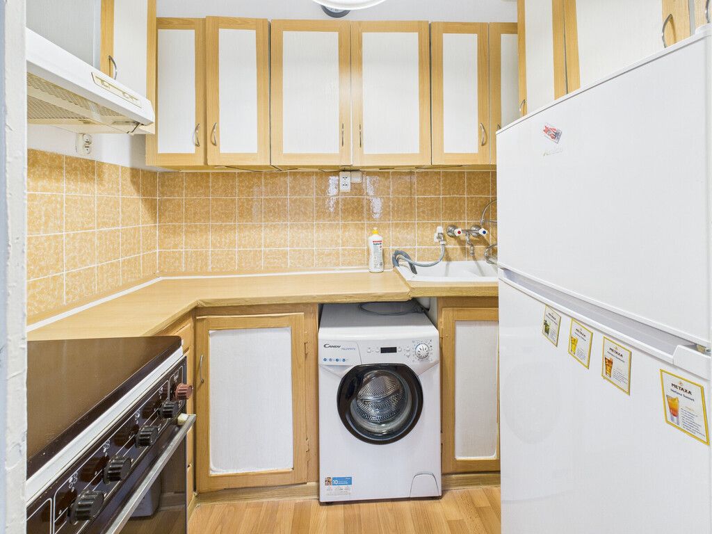 Wyposażenie kuchni: nowa lodówka, kuchenka gazowa z piekarnikiem, nowa pralka Candy.