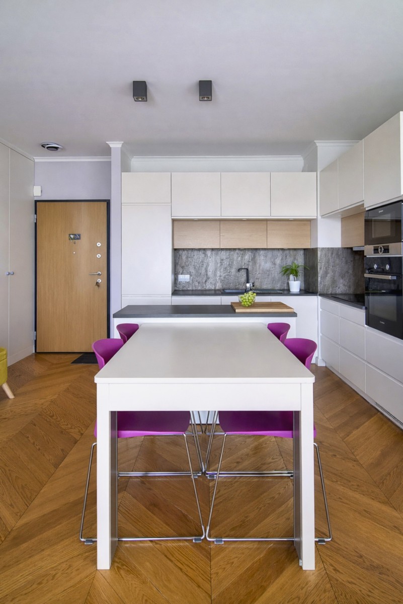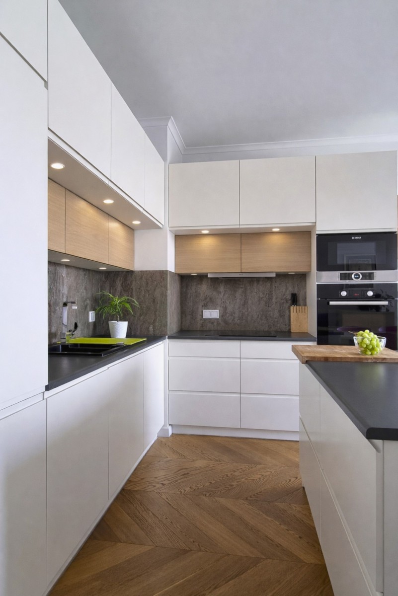 Kuchnia: lodówka, zamrażalnik, zmywarka, płyta indukcyjna, piekarnik, mikrofala w zabudowie.