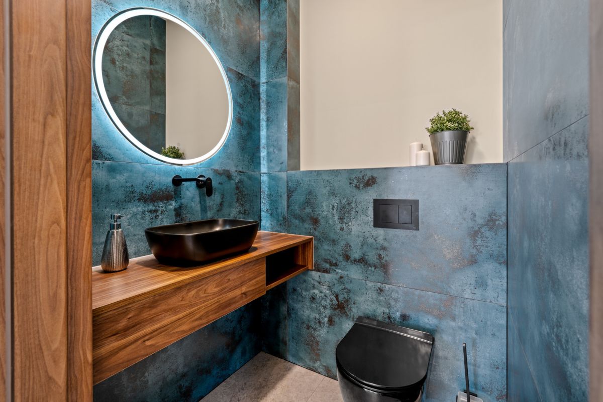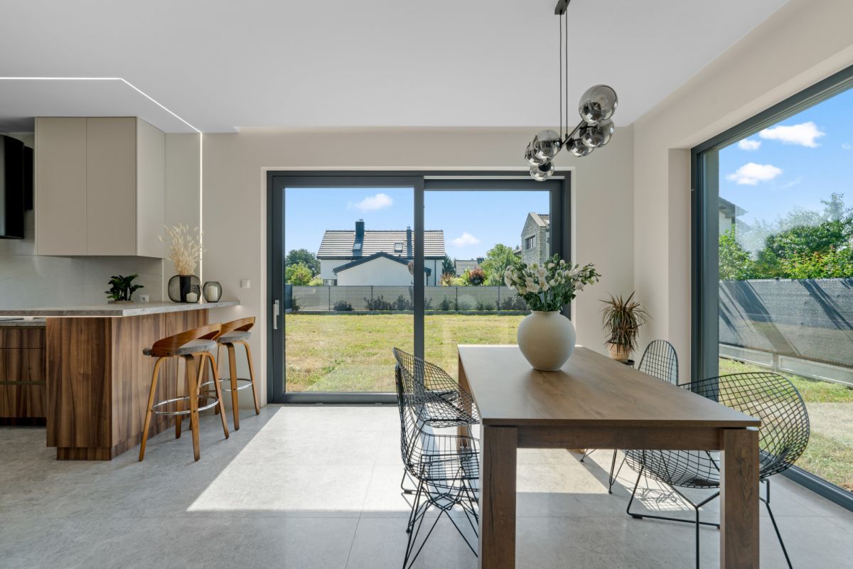 Nowoczesne rozwiązania obejmują m.in. pompę ciepła Daikin 6 kW. Podłogi wykonano z wysokiej jakości hiszpańskiego gresu, a sam budynek powstał w 2023 r. z ceramicznej cegły Porotherm 25 cm, co gwarantuje trwałość i energooszczędność.