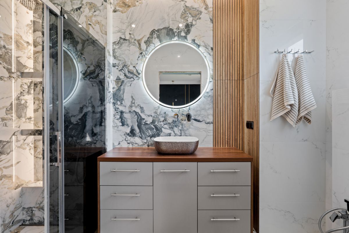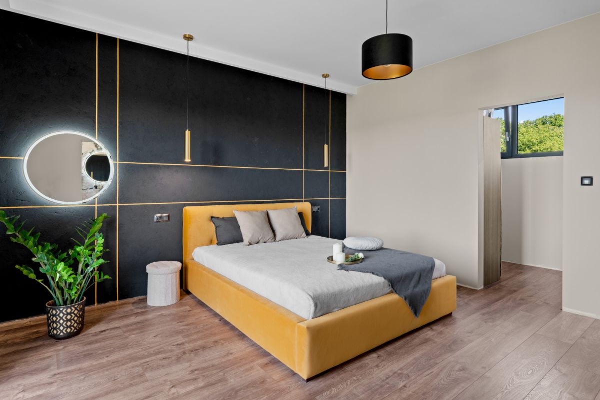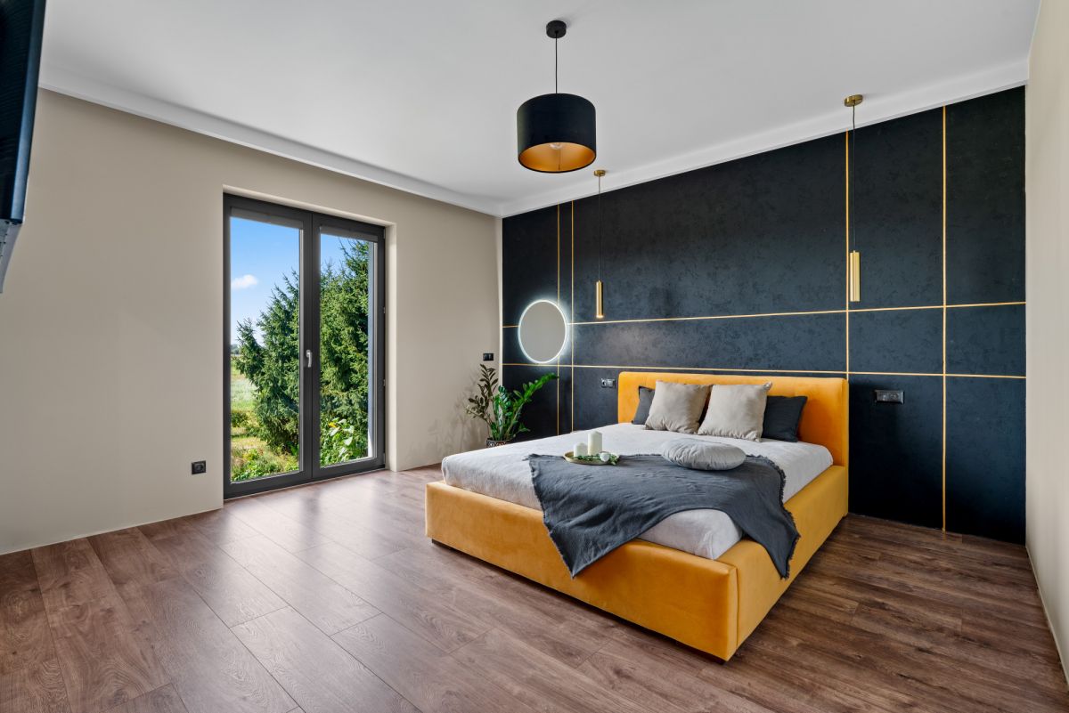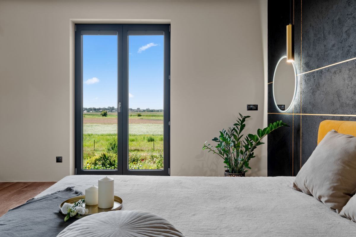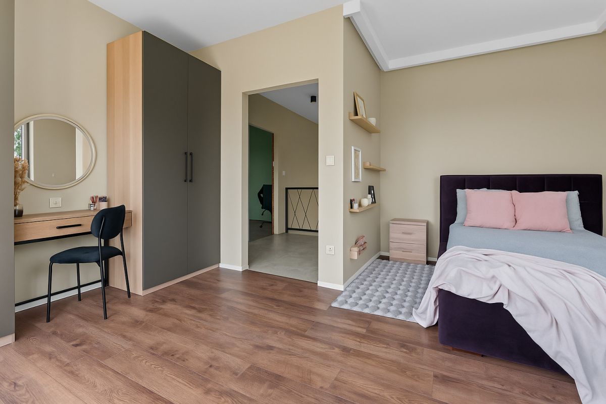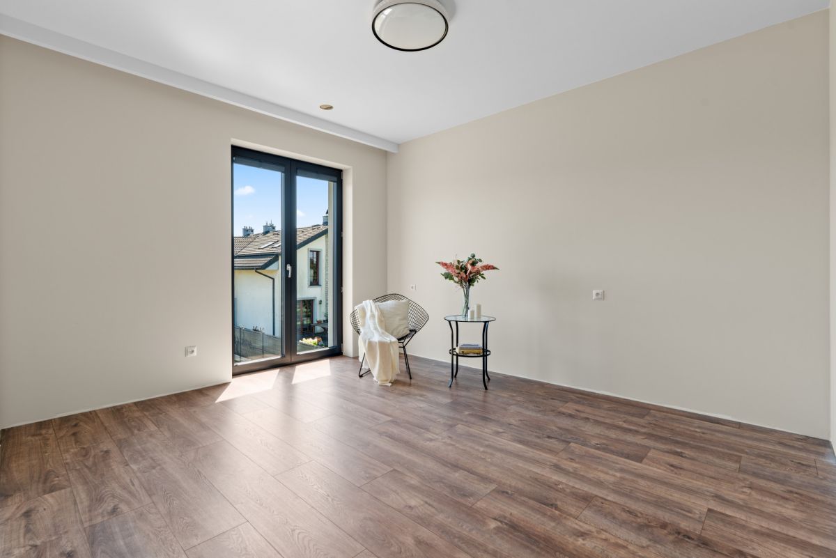 - przestronna sypialnia z widokiem na zieleń, połączona z własną łazienką i garderobą