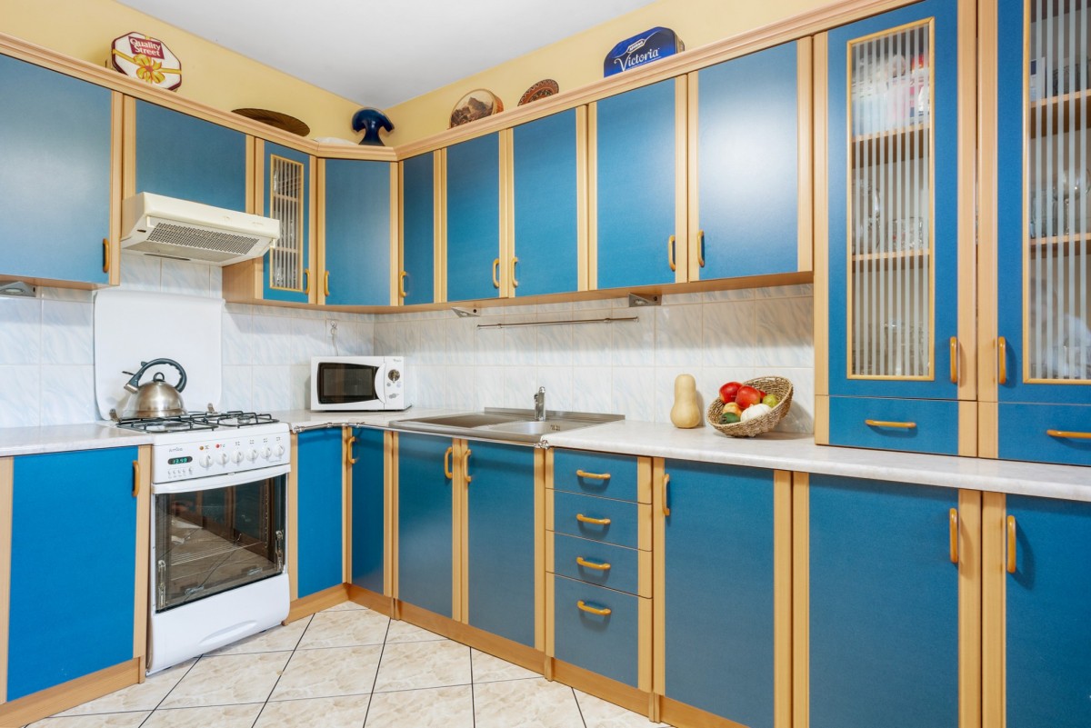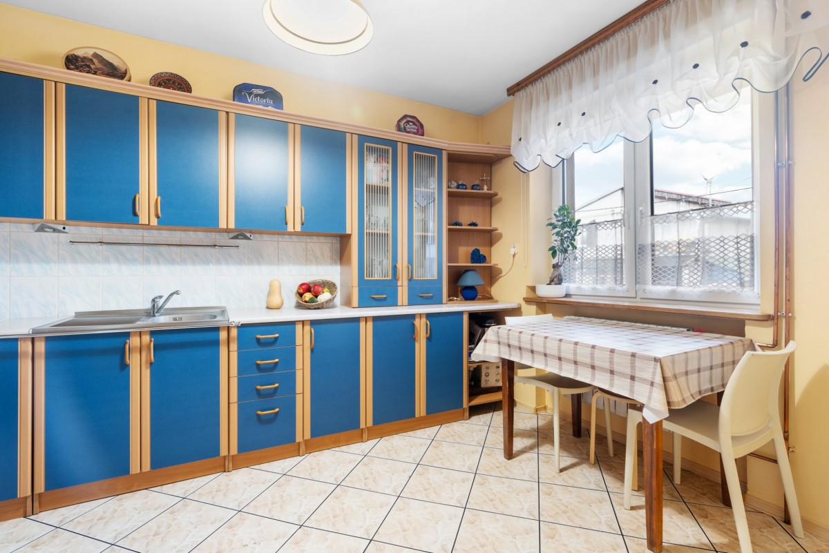 Kuchnia jest oddzielna i dobrze doświetlona, z oknem wychodzącym na bramę i furtkę. Dzięki temu można wygodnie obserwować, kto wraca do domu.