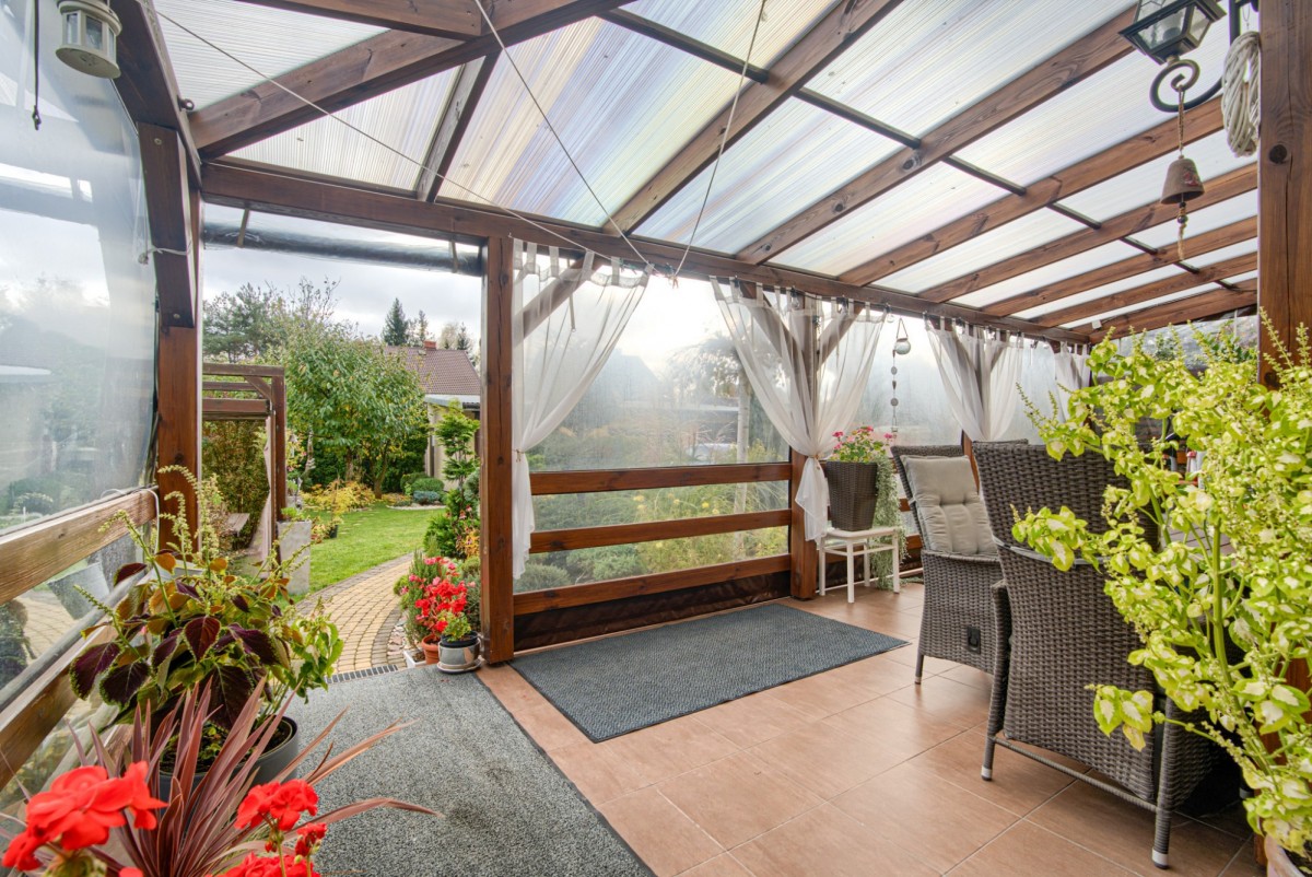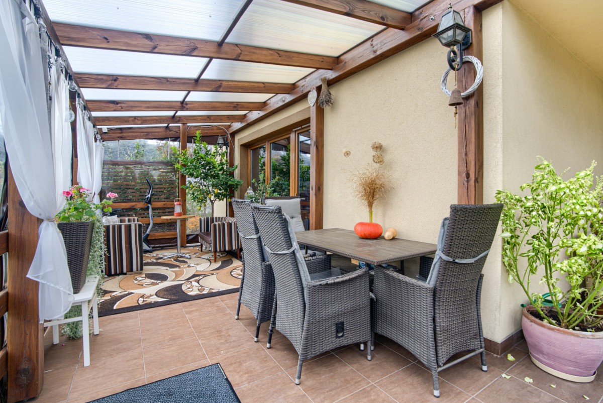 Przedłużeniem salonu jest przestronny, zadaszony taras, który idealnie sprawdzi się zarówno latem, jak i zimą. Dzięki zadaszeniu można korzystać z niego przez cały rok - jako miejsce na relaks, spotkania rodzinne czy dodatkową przestrzeń rekreacyjną, niezależnie od pogody.