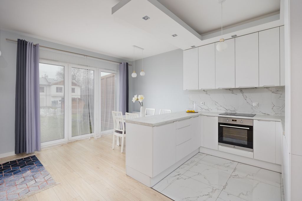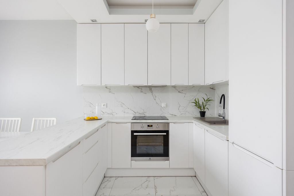 Nowoczesna, minimalistyczna kuchnia w zabudowie, w całości biała, z dużą ilością szafek i marmurowym gresem na podłodze. Przestrzeń jasna, elegancka, z estetycznym oświetleniem sufitowym.