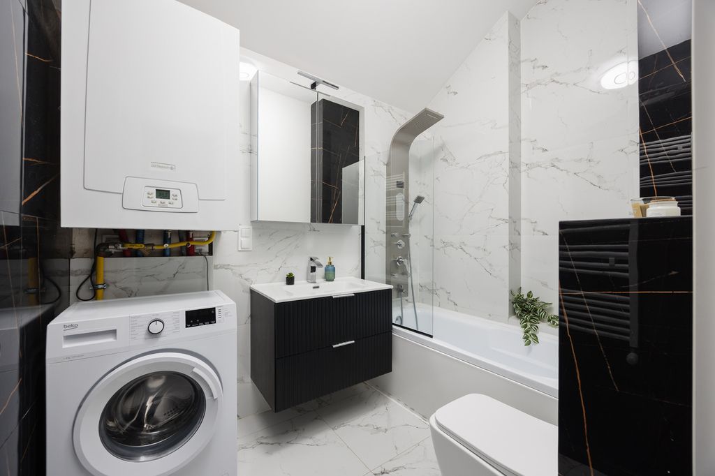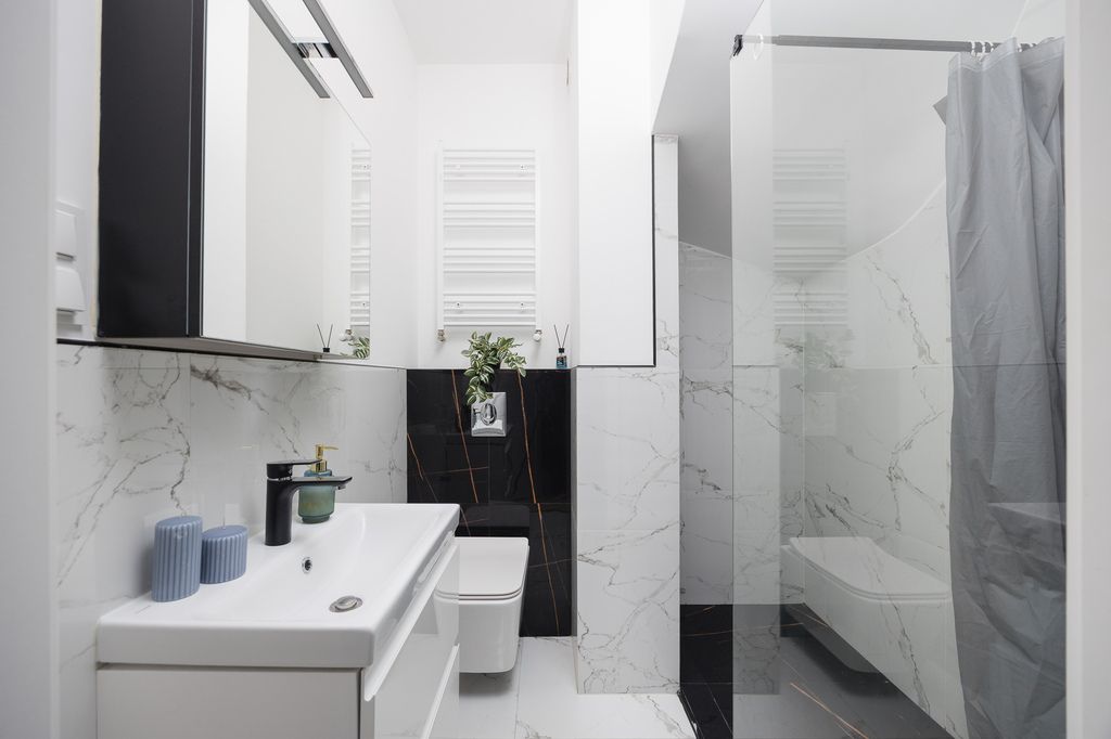 Obie wykończone gresami wielkoformatowymi imitującymi marmur, z kontrastującymi czarnymi płytami z miedzianą żyłą — efekt widoczny na zdjęciach. Nowoczesna ceramika, elegancka zabudowa meblowa, czarna armatura i wykończenia. W jednej z łazienek znajduje się piec gazowy De Dietrich.