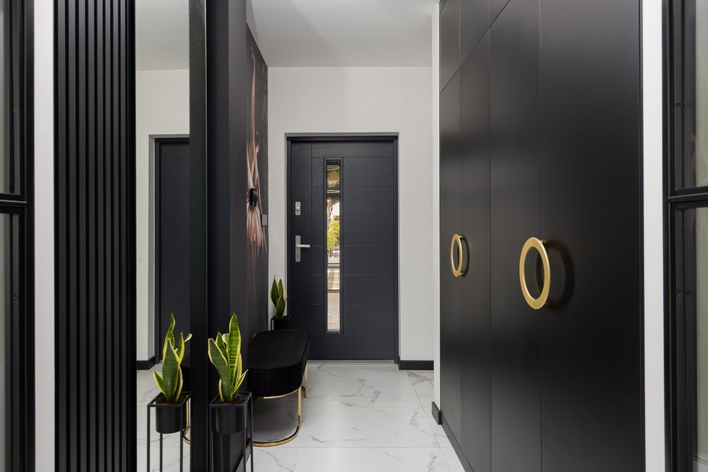Wiatrołap pełni rolę praktycznej strefy wejściowej, w której znajduje się pojemna szafa w zabudowie. Przestrzeń ta została zaprojektowana z myślą o wygodnym przechowywaniu odzieży i obuwia.