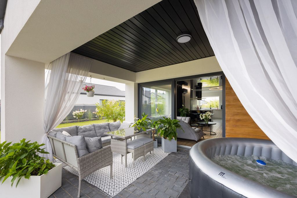 Przemyślanie urządzony ogród oferuje wyjątkowy komfort oraz funkcjonalność dla całej rodziny. Bezpośrednio z każdego pokoju można wyjść do ogrodu, co zapewnia łatwy dostęp do zielonej przestrzeni o każdej porze dnia. W centralnej części znajduje się taras w podcieniu, wyposażony w wygodne meble ogrodowe oraz zupełnie nowe jacuzzi, tworzące idealne miejsce do wypoczynku niezależnie od pogody. Ogród zdobią liczne nasadzenia: pachnące lilaki, eleganckie wierzby, bujne hortensje, a także ozdobne trawy.