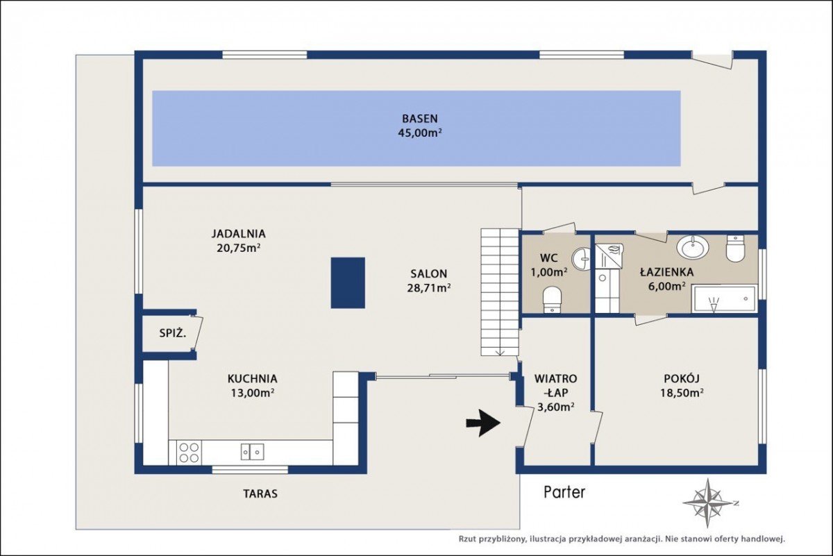 Na parterze mamy przestronny salon z jadalnią i kominkiem, kuchnię ze spiżarnią, pokój, łazienkę z wc, wiatrołap oraz basen.