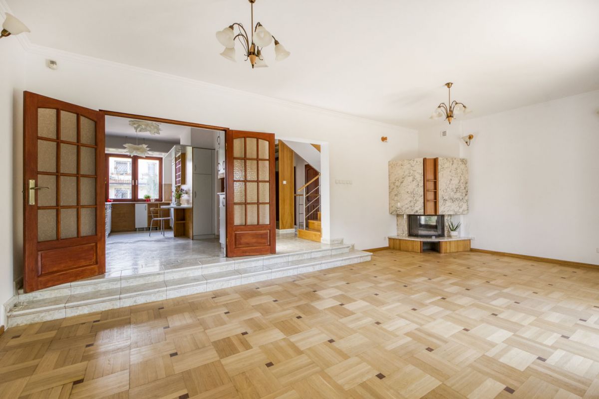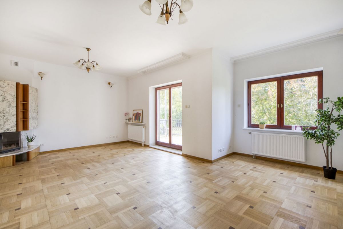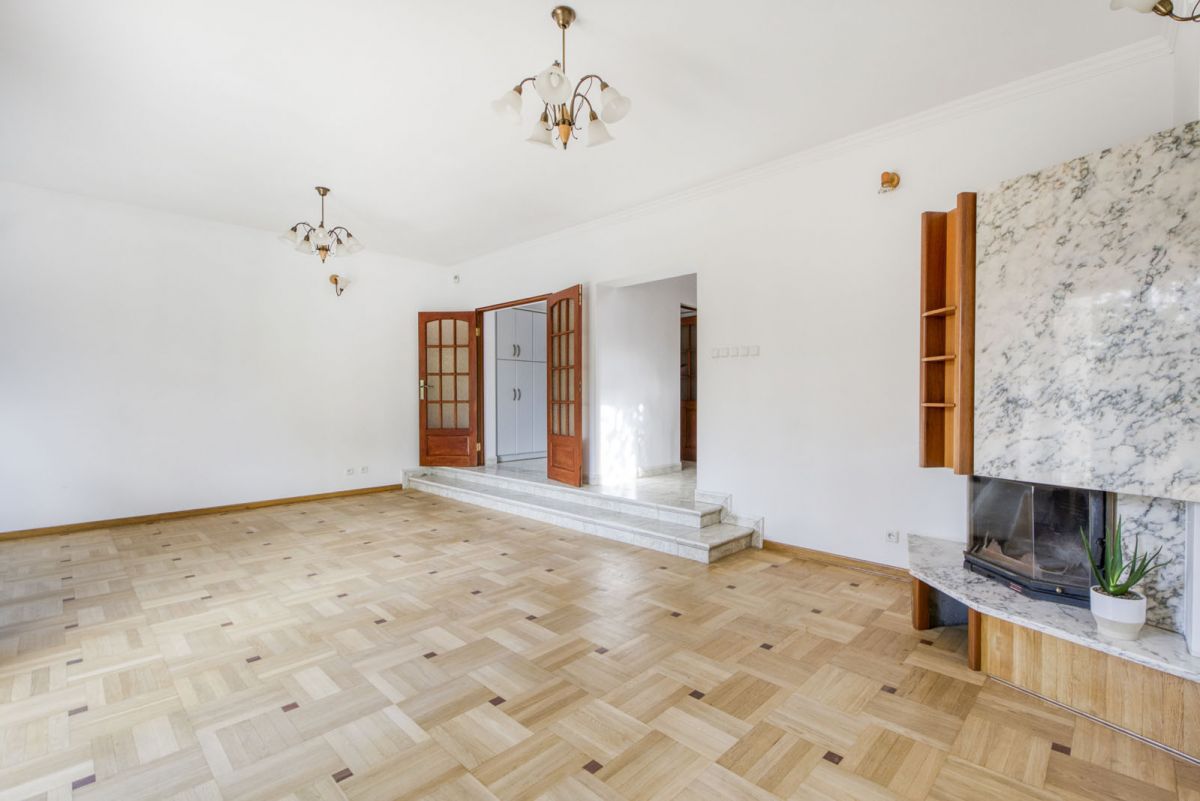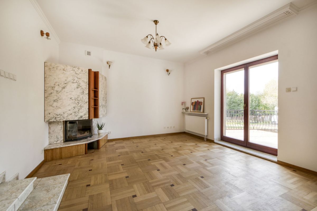 Wnętrza utrzymane w klasycznym stylu - drewniane podłogi, marmurowe elementy, kominek w salonie, duże okna zapewniające doskonałe doświetlenie.
