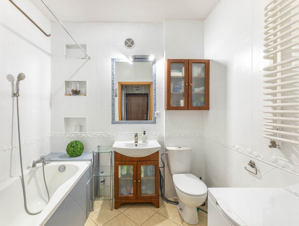 The apartment is in good condition and needs updating. The property is quiet, bright, and functional. The flooring is wood paneling and stoneware. The apartment has district heating and a plastic heating system. Built-in furniture is included in the price. Appliances are not included.