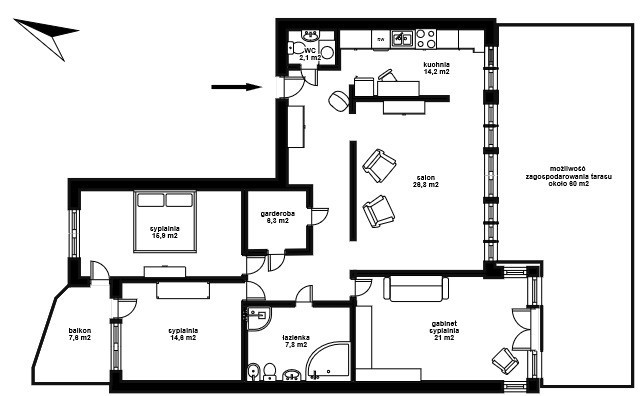 - Salon (26,78 m²) - przestronny i doskonale doświetlony, z wyjściem na balkon