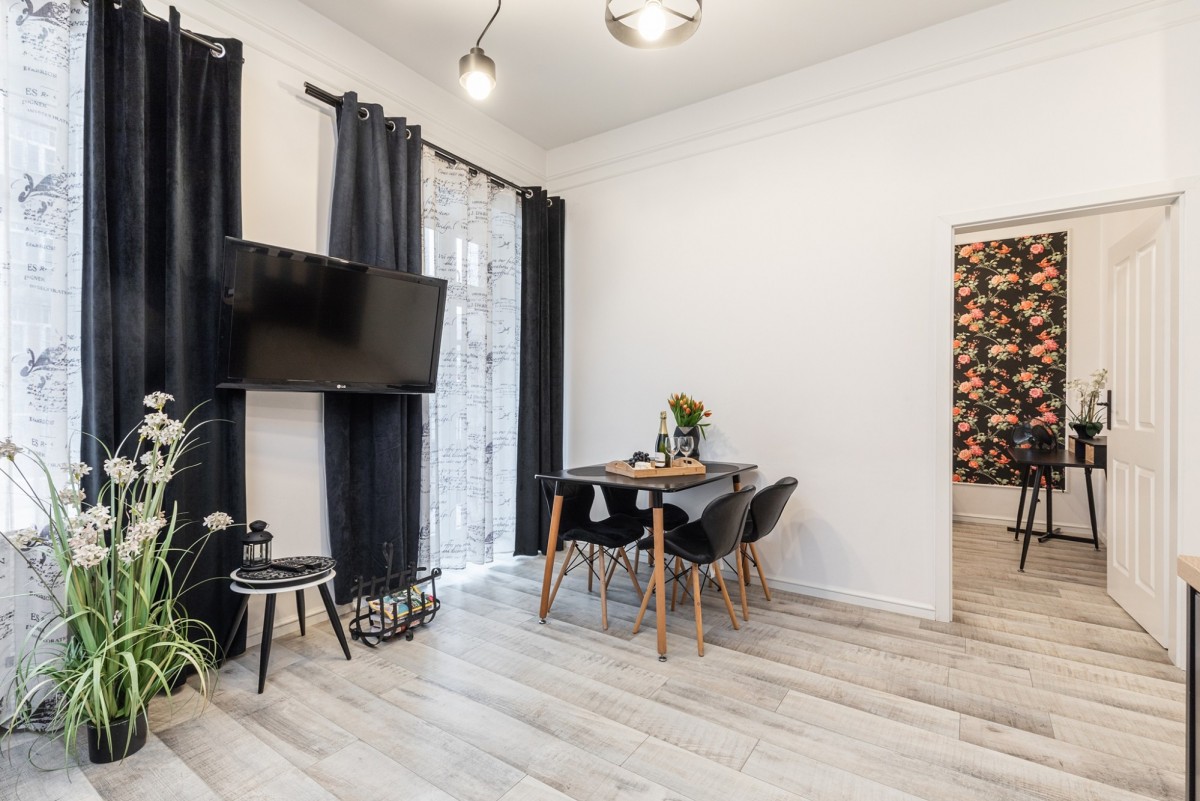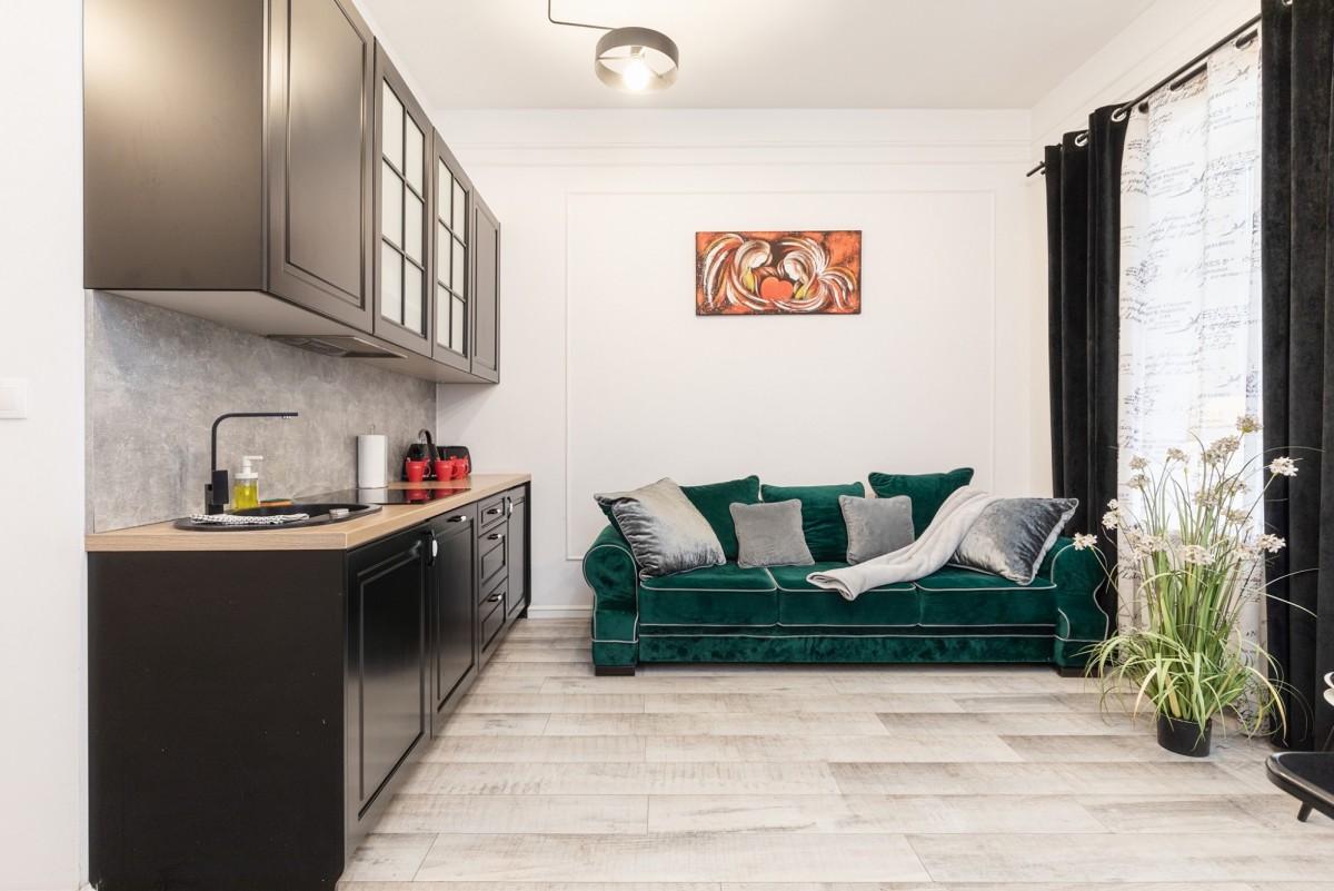 Tastefully furnished space with a total area of almost 35 m². It includes a hall with built-in wardrobe, a fully equipped living room with a kitchenette and exit to a balcony, a spacious bedroom, and a large bathroom with a shower.