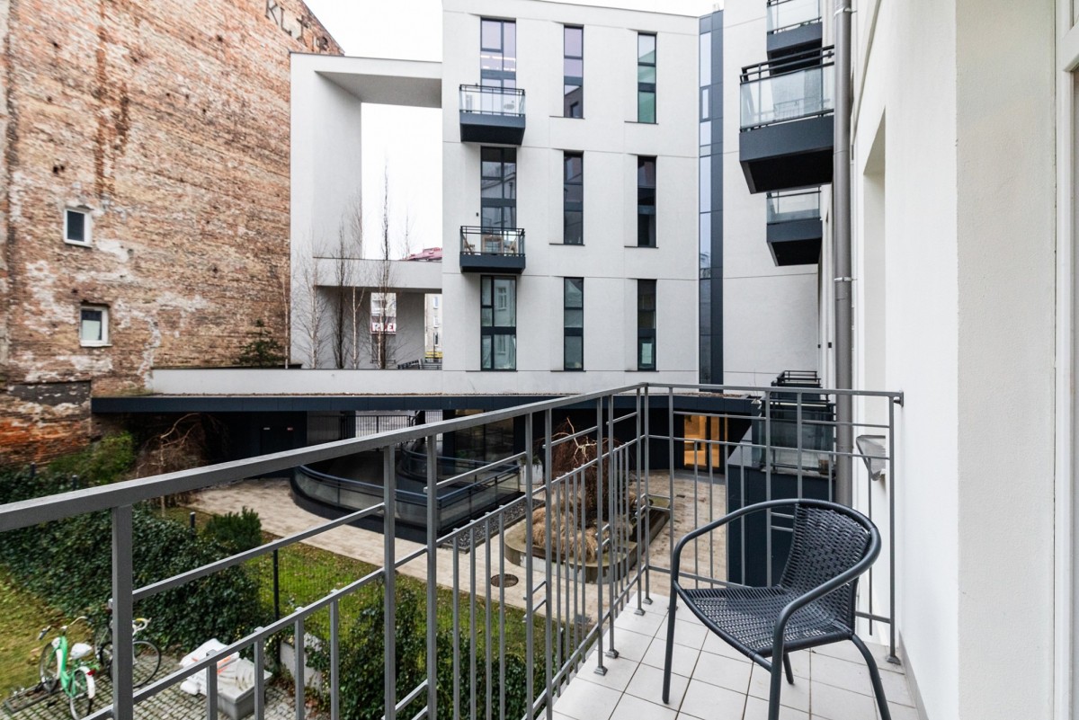 Lokal jednostronny - ekspozycja południowo zachodnia. Widok na bardzo ładnie zagospodarowane patio i sąsiednie budynki. Dzięki przestrzeni między budynkami nie ma tu efektu studni. Wszystkie media miejskie.