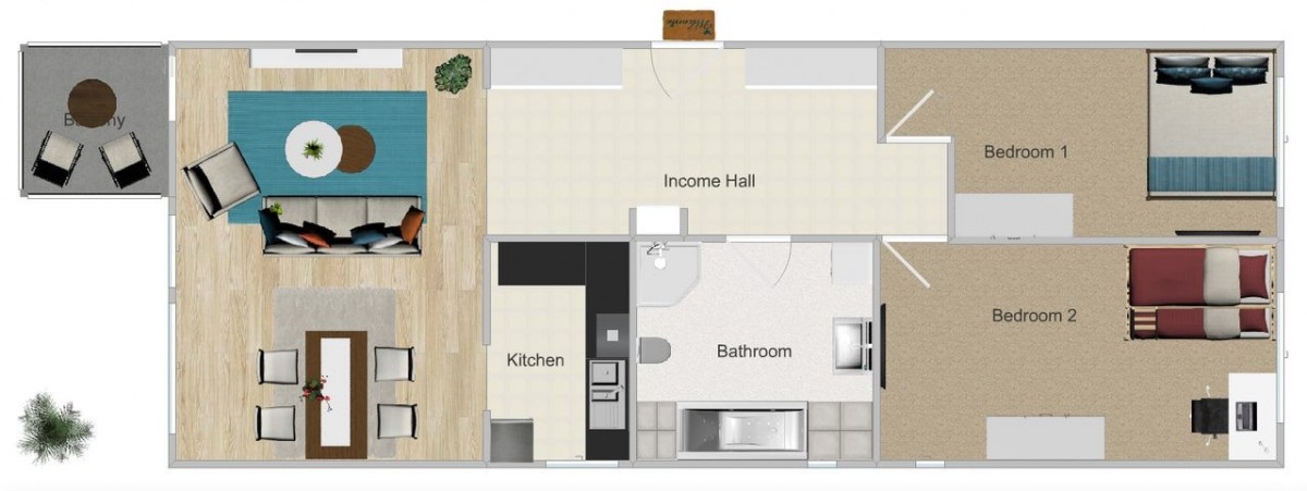 Mieszkanie cechuje się funkcjonalnym i wygodnym układem pomieszczeń. W skład nieruchomości wchodzą: salon, dwa pokoje, kuchnia, łazienka oraz przedpokój. Dodatkowo do mieszkania przynależy balkon, z którego można korzystać jako strefy wypoczynku.
