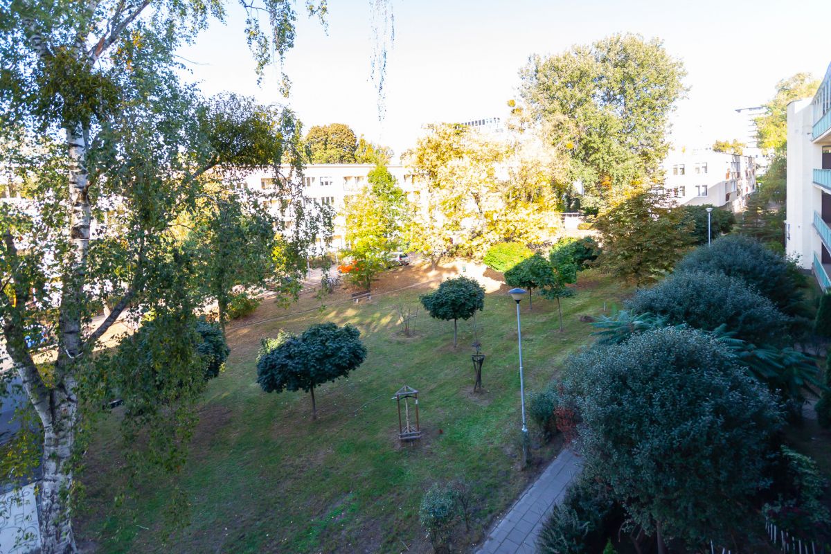 jeden z pokoi posiada balkon z widokiem na zielony plac między budynkami,