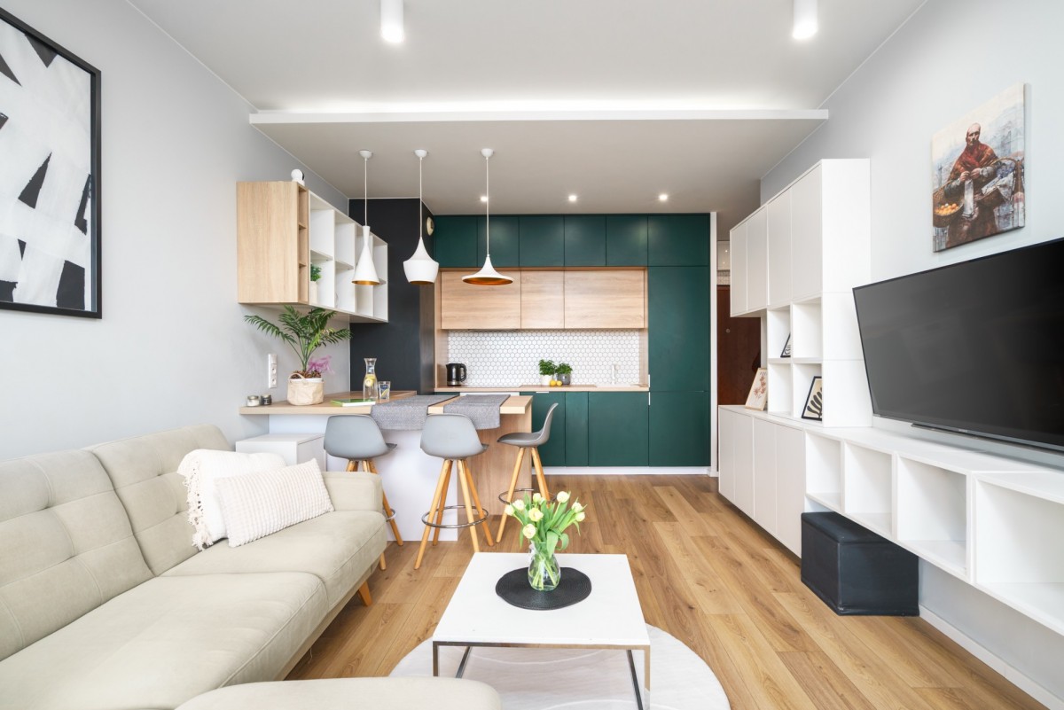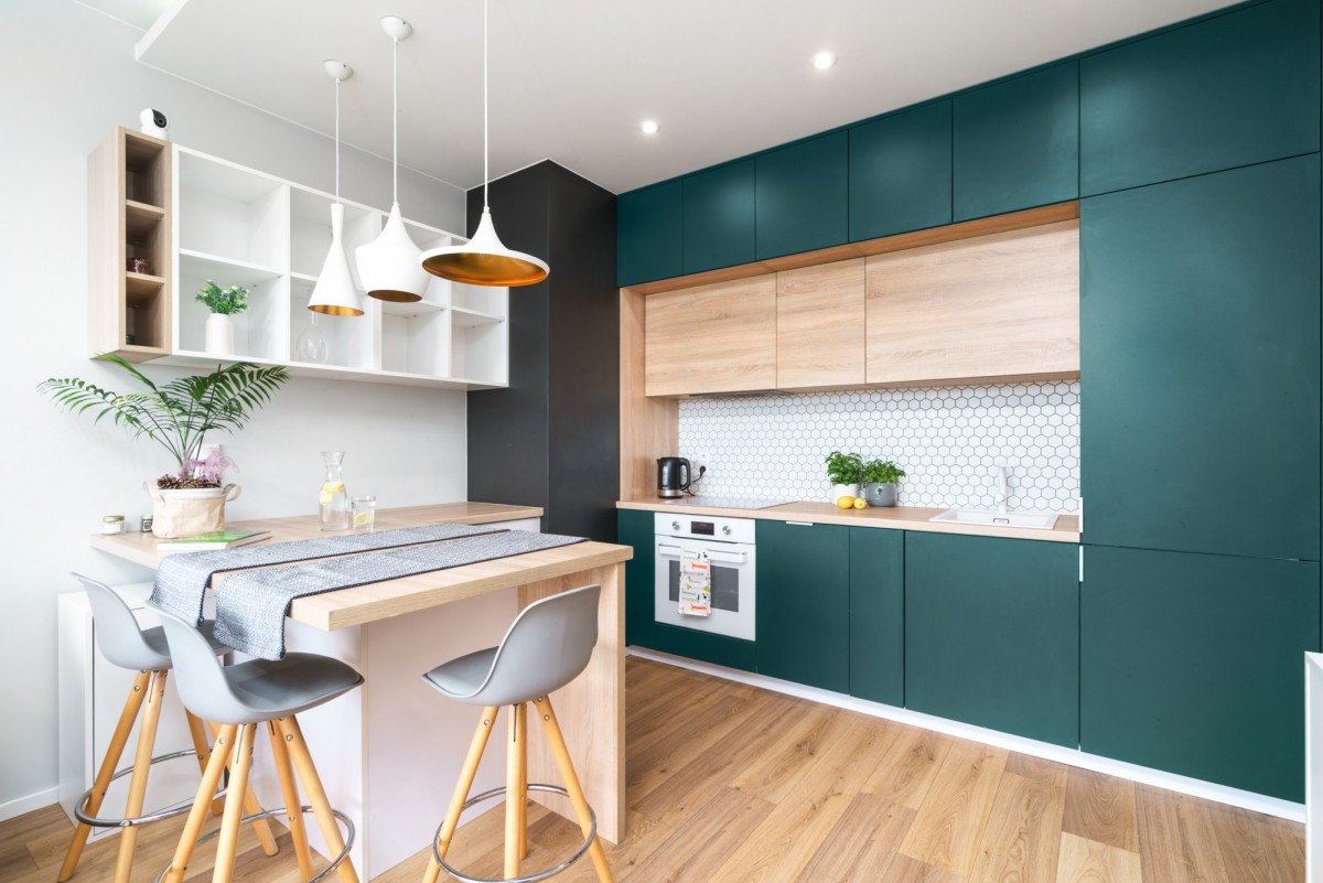 Fronty w odcieniu butelkowej zieleni stanowią stylowy akcent na tle jasnych, pastelowych kolorów ścian i zabudowy.
