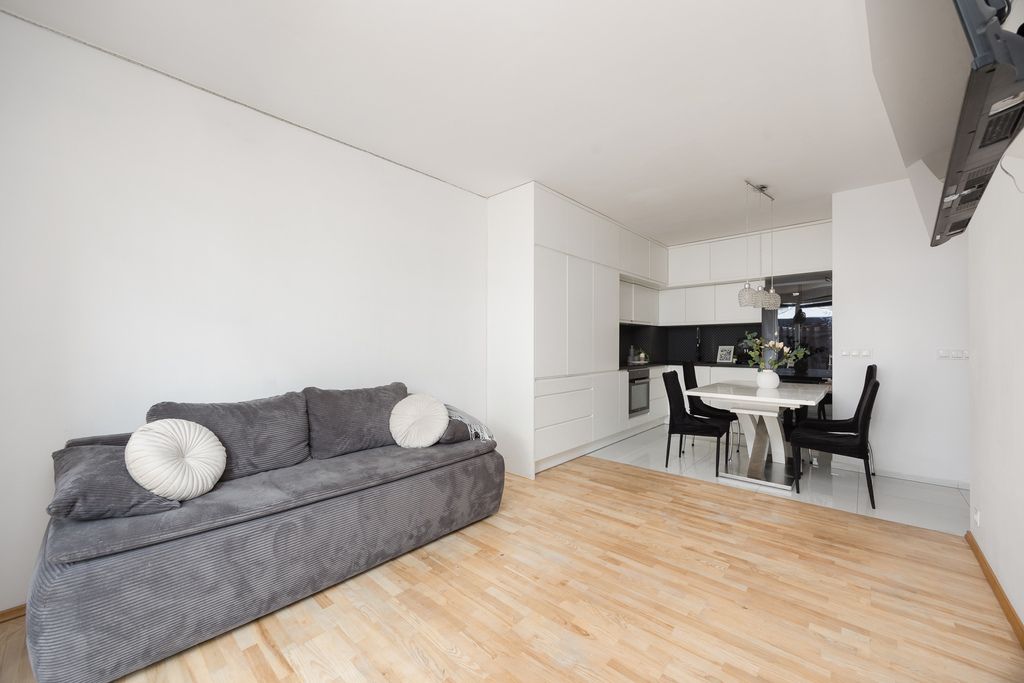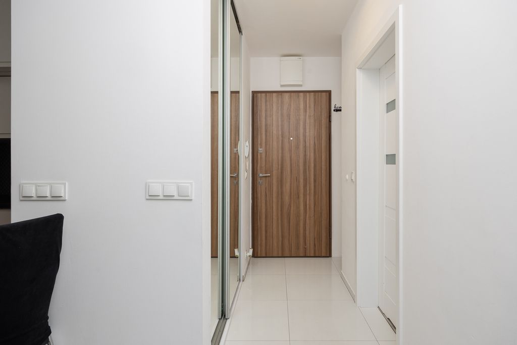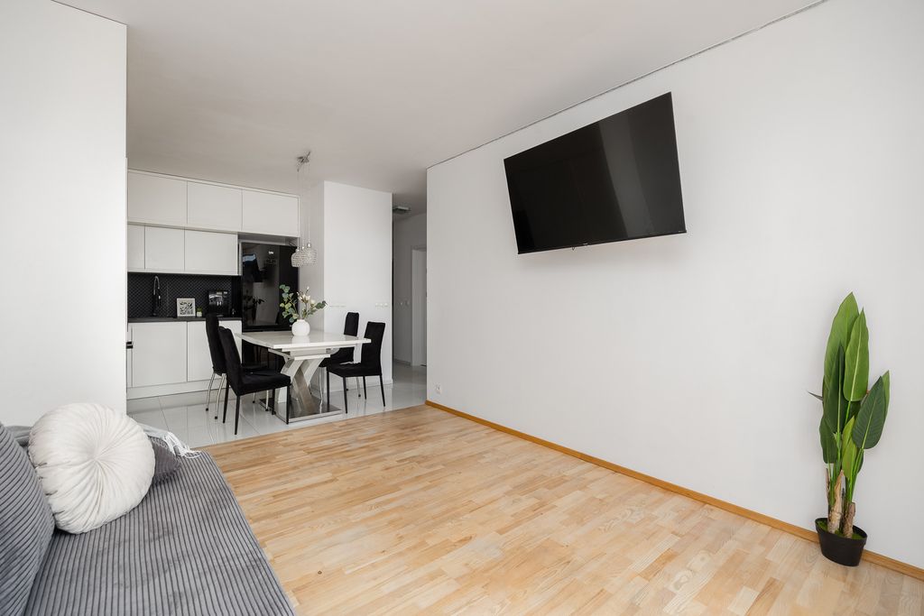 Mieszkanie wykończone w dobrym standardzie. Na podłogach położono jesionową deskę barlinecką oraz nowoczesny gres. W części salonu zastosowano ogrzewanie podłogowe, co zwiększa komfort użytkowania. Kuchnia została wykonana na wymiar i w pełni wyposażona w m.in. zmywarkę, płytę indukcyjną, system cargo, ledowe podświetlenie oraz pojemne szuflady z cichym domykiem. W sypialni oraz przedpokoju znajdują się bardzo pojemne szafy wnękowe. Łazienka wyposażona jest w wannę z funkcją prysznica, pralko-suszarkę oraz praktyczne szafki w zabudowie - zarówno pod umywalkę, jak i nad pralką. Istnieje możliwość pozostawienia pełnego wyposażenia mieszkania.