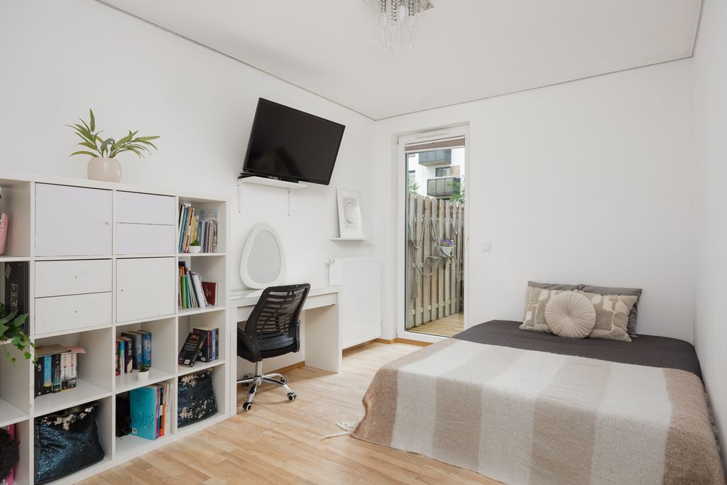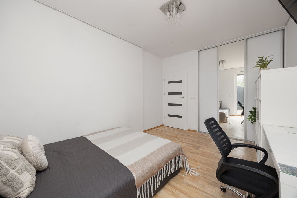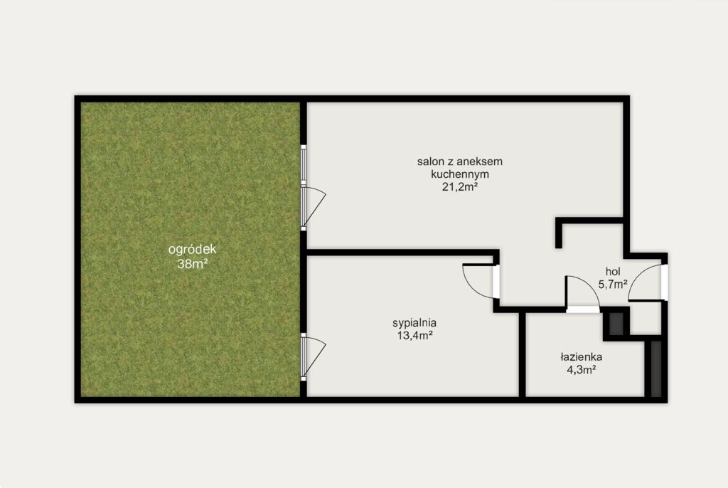 Do mieszkania przynależy ogródek o powierzchni około 30 m2, z bezpośrednim wyjściem zarówno z salonu, jak i z sypialni. Przestrzeń została wyłożona deską z naturalnego drewna (świerku) i wyposażona w domek narzędziowy oraz pawilon ogrodowy, co tworzy idealne miejsce do wypoczynku i spędzania czasu na świeżym powietrzu.