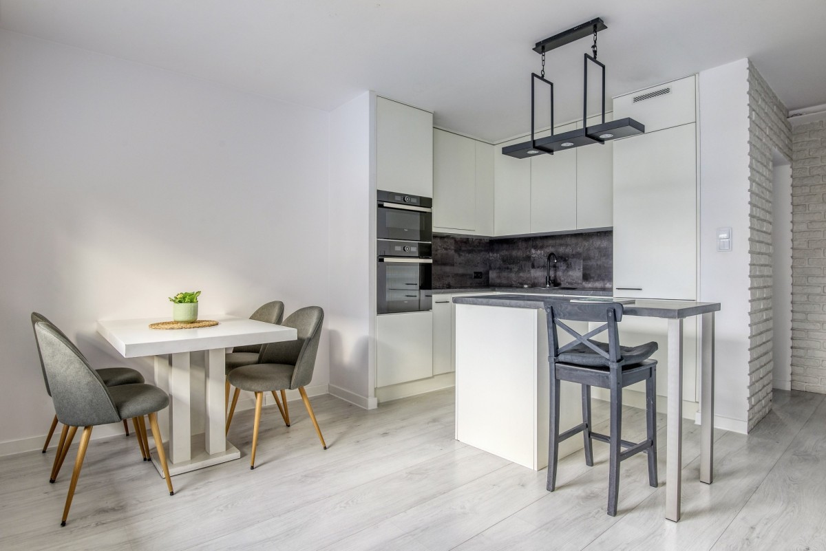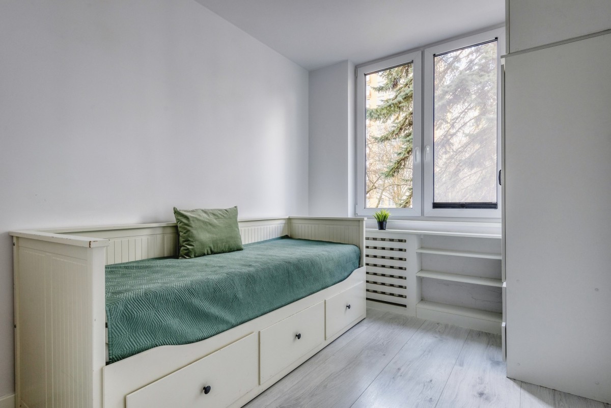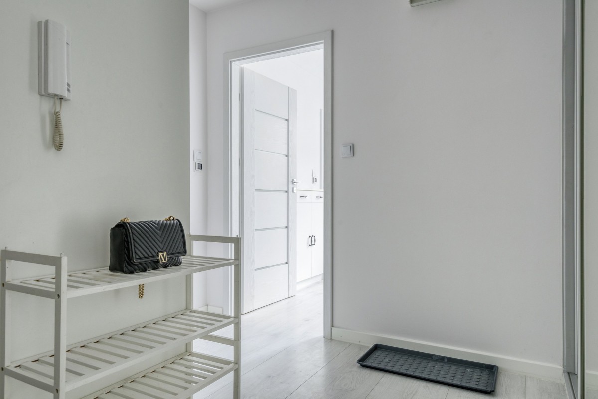 W mieszkaniu trzy oddzielne sypialnie (w tym jedna z prywatną łazienką), salon z otwartą kuchnią, garderoba i pojemne szafy.