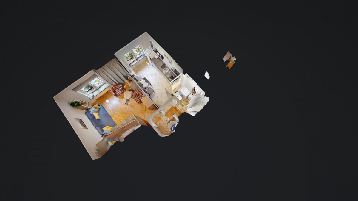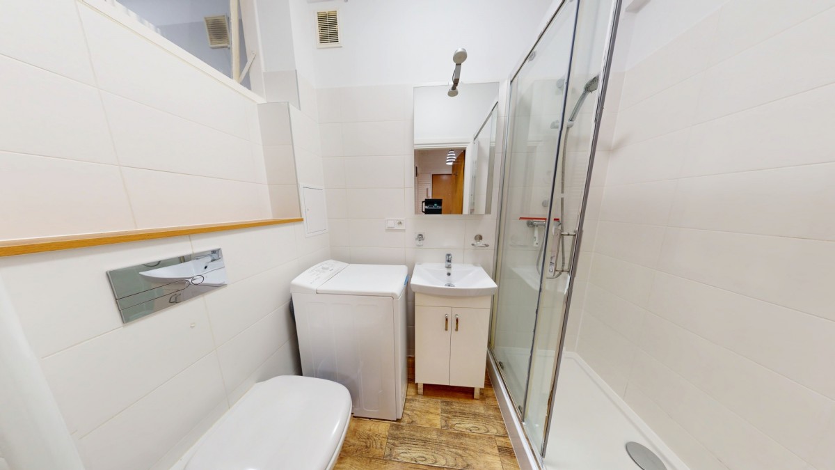 - Łazienka (3 m²) z kabiną prysznicową, pralką,