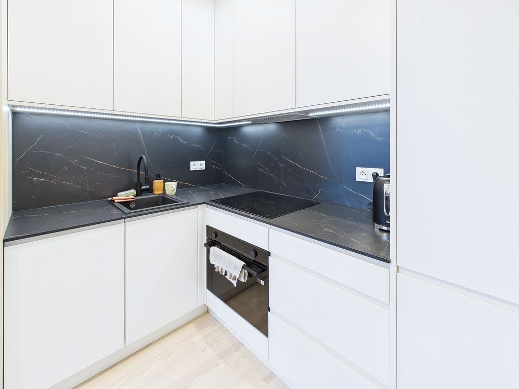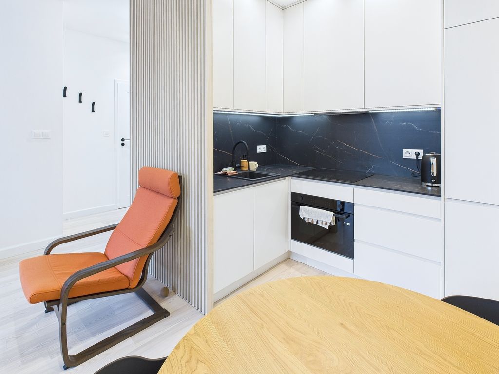 - Salon z aneksem kuchennym: Otwarta, słoneczna przestrzeń dzienna. Aneks kuchenny jest w pełni wyposażony w niezbędny sprzęt AGD (lodówka, zmywarka, płyta grzewcza, piekarnik).