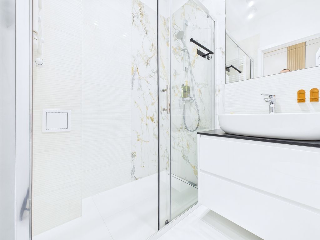 - Łazienka: Funkcjonalnie zaprojektowana, wyposażona w pralkę oraz wygodną kabinę prysznicową/wannę.