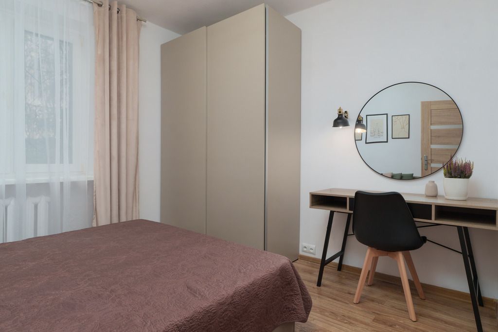 Drugi pokój (9,9 m²) jest pusty, dzięki czemu można go zaaranżować po swojemu: jako sypialnię, pokój dziecka, gabinet albo przestrzeń do pracy. Właściciele są gotowi doposażyć go według potrzeb przyszłego najemcy.